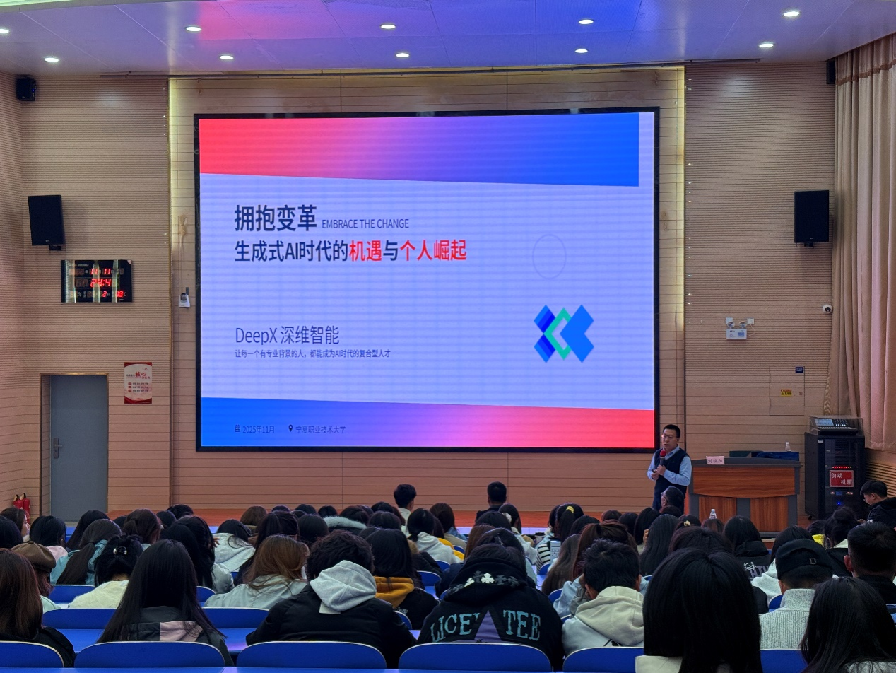 在人工智能(AI)技术迅猛发展的今天,如何将其与商科教育、创新创业教育相结合,成为了高等职业教育领域的重要课题。2025年11月11日,宁夏职业技术大学商学院在竞智楼一楼阶梯教室举办主题为“拥抱变革AI时代的机遇与个人崛起”的专题讲座,旨在探讨人工智能技术在创新创业中的应用及其带来的机遇与挑战。本次讲座由宁夏深维智能科技有限公司董事长刘端阳主讲,商学院副院长王庆锋、甘肃北蒙实业发展有限公司(宁职—天猫校园店)店长陈乾、商学院师生代表近160人参加本次讲座。