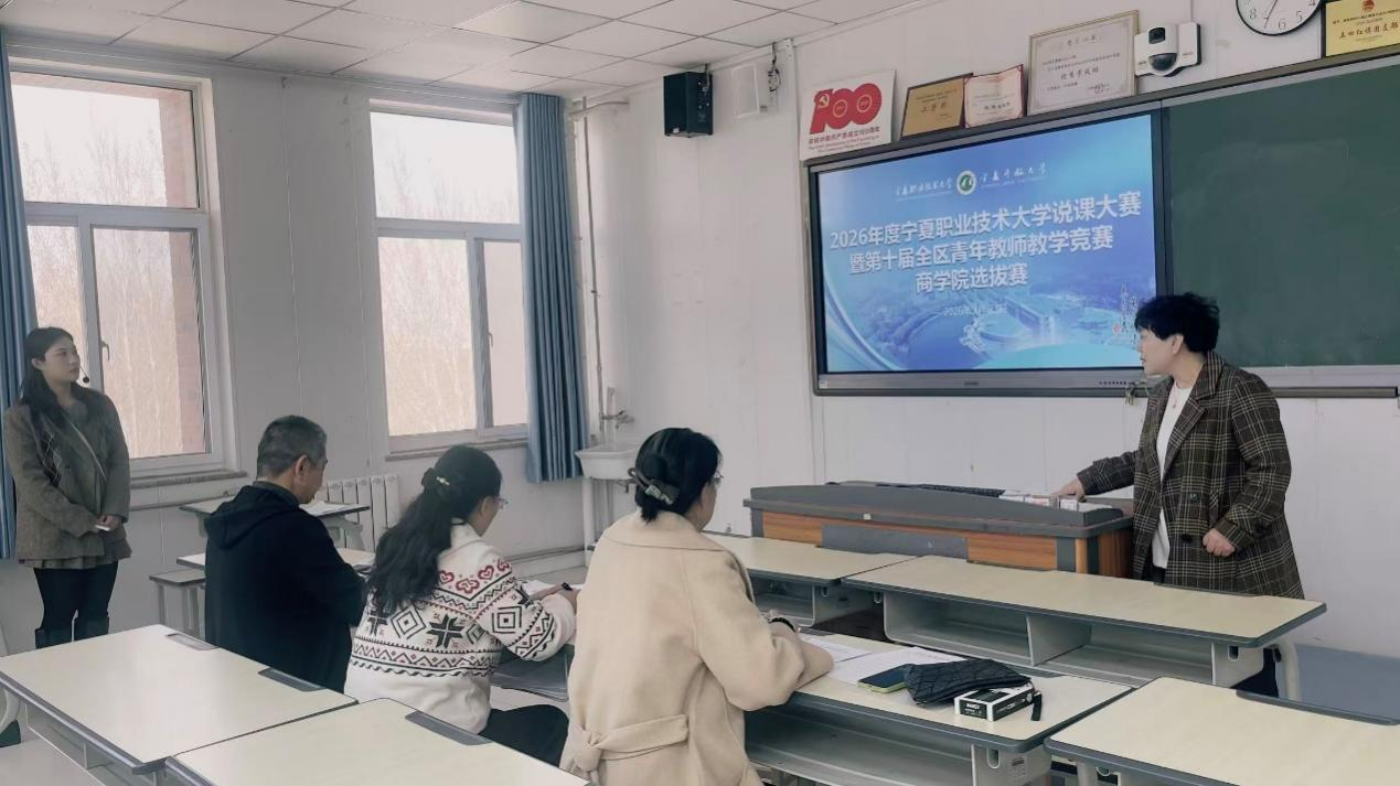 为深入贯彻学校《关于举办2026年度宁夏职业技术大学说课大赛暨第十届全区青年教师教学竞赛校内选拔赛的通知》精神,全面提升我院青年教师教学能力、专业素养与教学创新水平,选拔推荐优秀教师参加校级比赛,3月23日、31日,商学院举办了2026年度说课大赛暨第十届全区青年教师教学竞赛院内选拔赛。